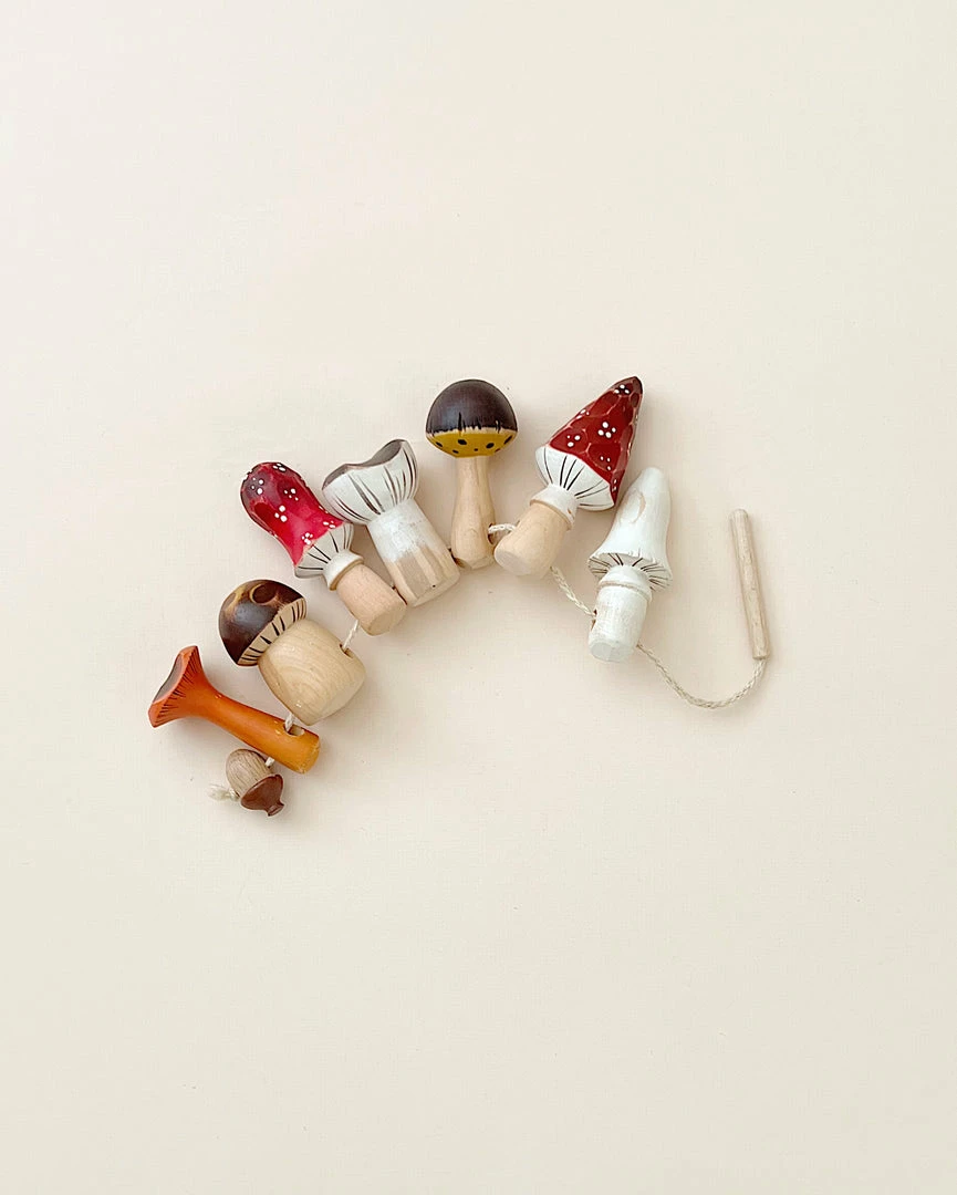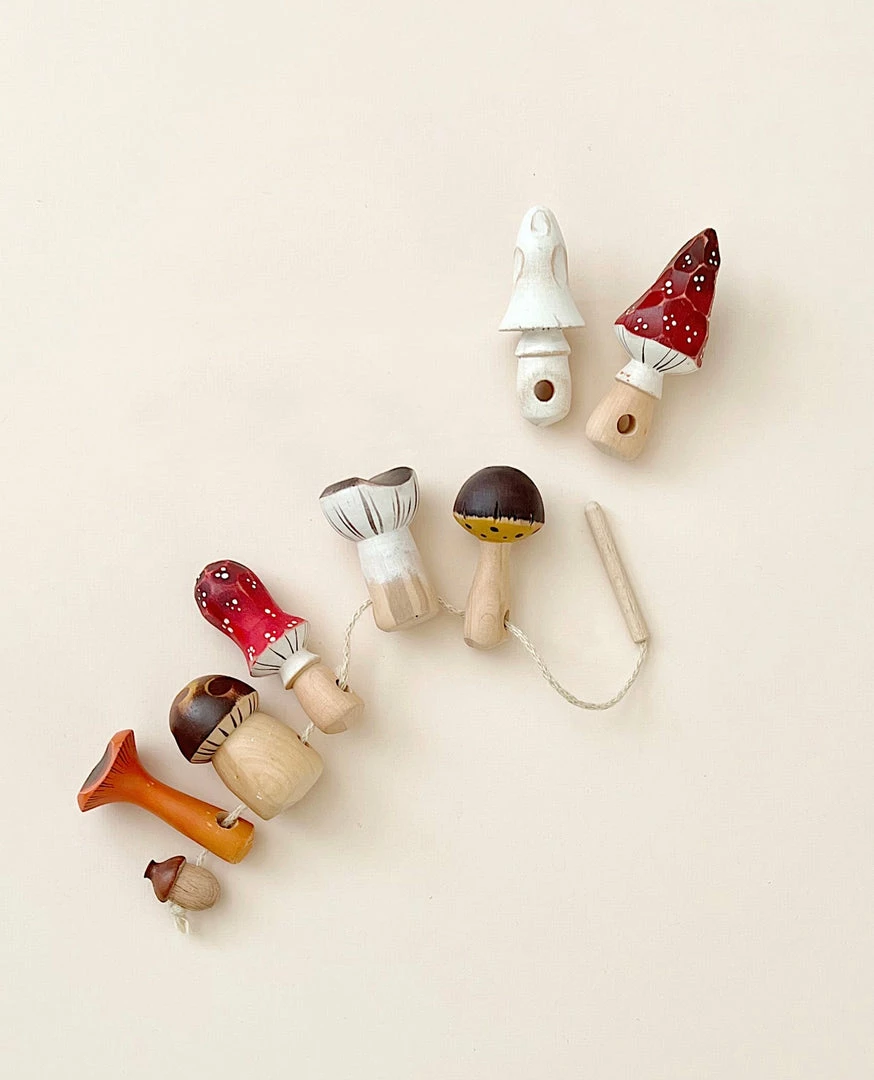 This set includes 7 handmade mushrooms and a little acorn. Little ones can use the included lace and wooden needle to lace all the mushrooms together.Â