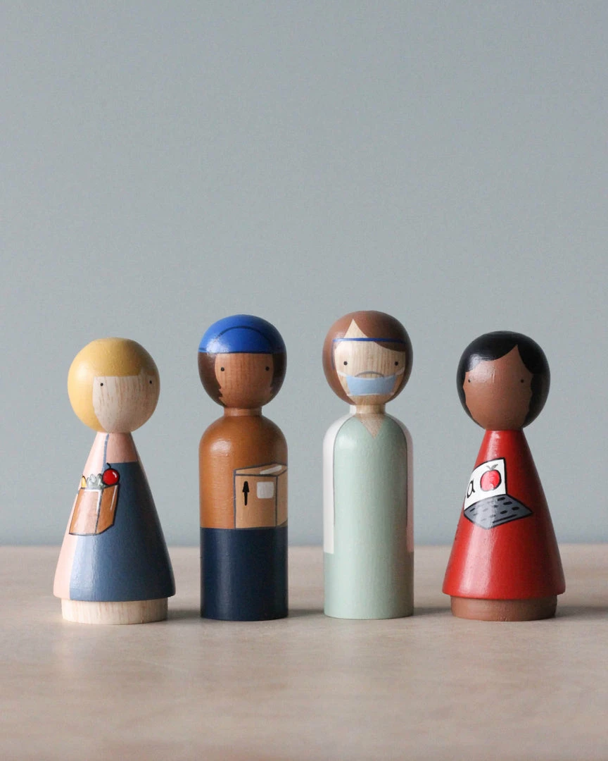 Essential Workers includes four 3.5″ dolls, featuring a Clerk, a Delivery Person, a Teacher, and a Healthcare Worker.