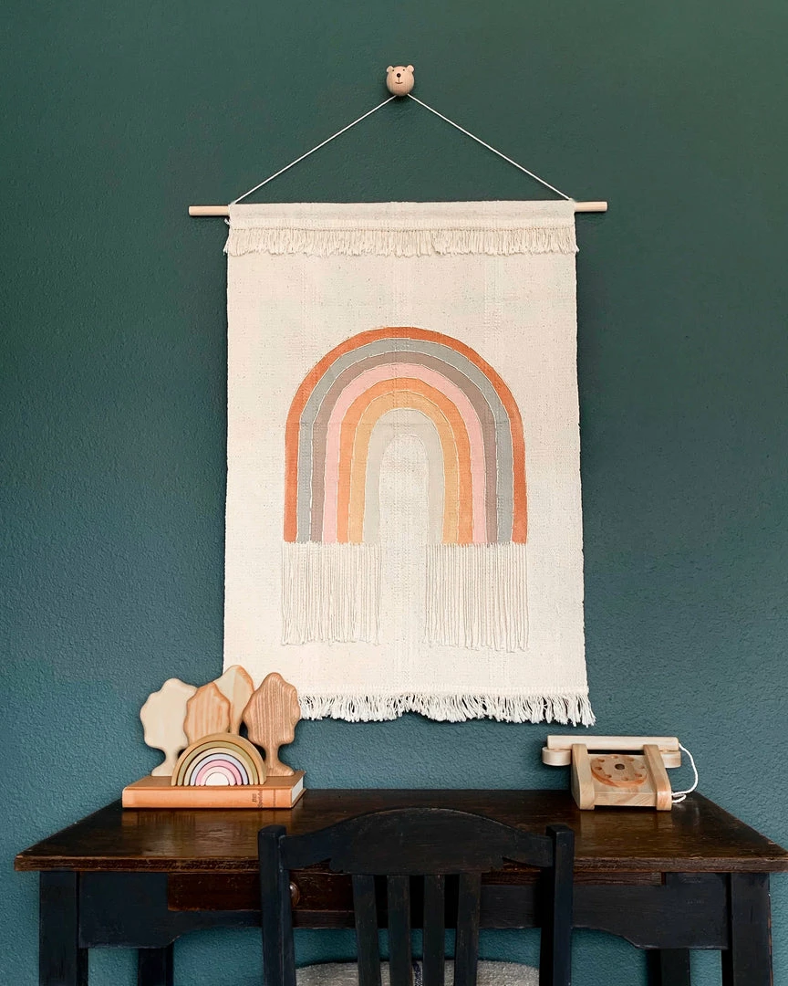 This rainbow wall hanging is hand stitched and painted in Russia. Ideal for playrooms and nurseries, use this wall decor to brighten any room.
