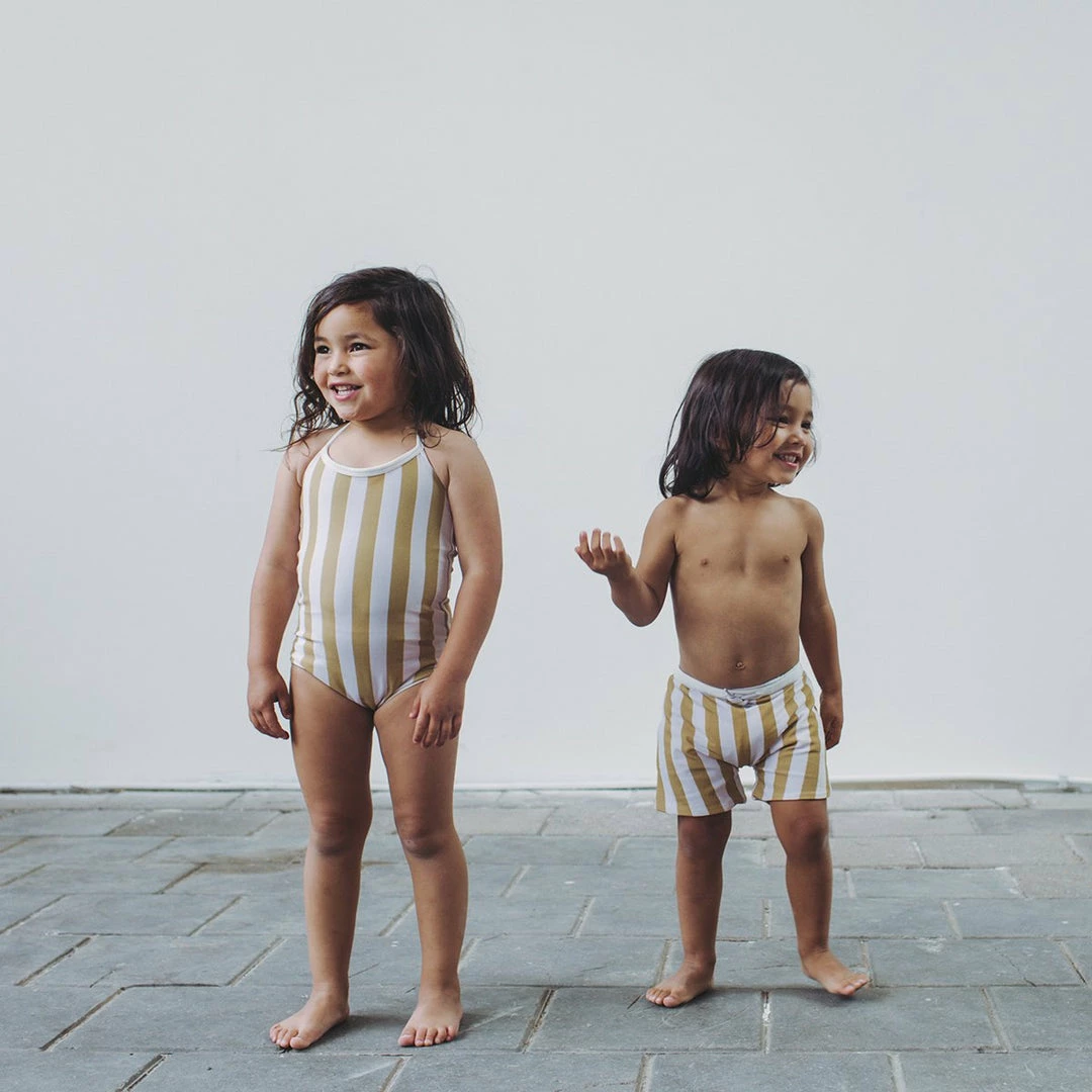 SPF50+ fully lined swimsuit in color ‘Russet’ with contrasting ties that fasten in neck. Care instructions: hand wash only, rinse after each use.