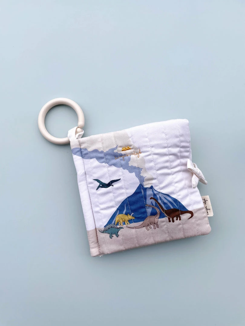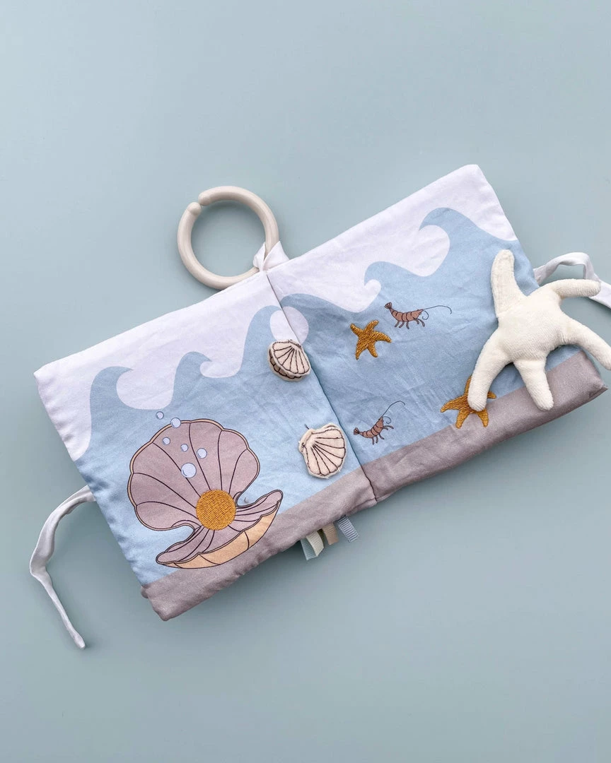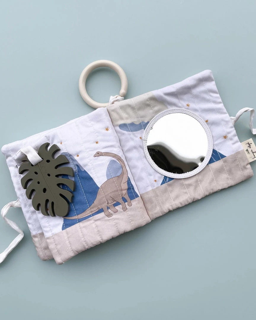 This cute fabric book can be attached to a stroller or used independently as an activity toy for your baby. Inside the fabric book your little one will discover lots of interesting finds.