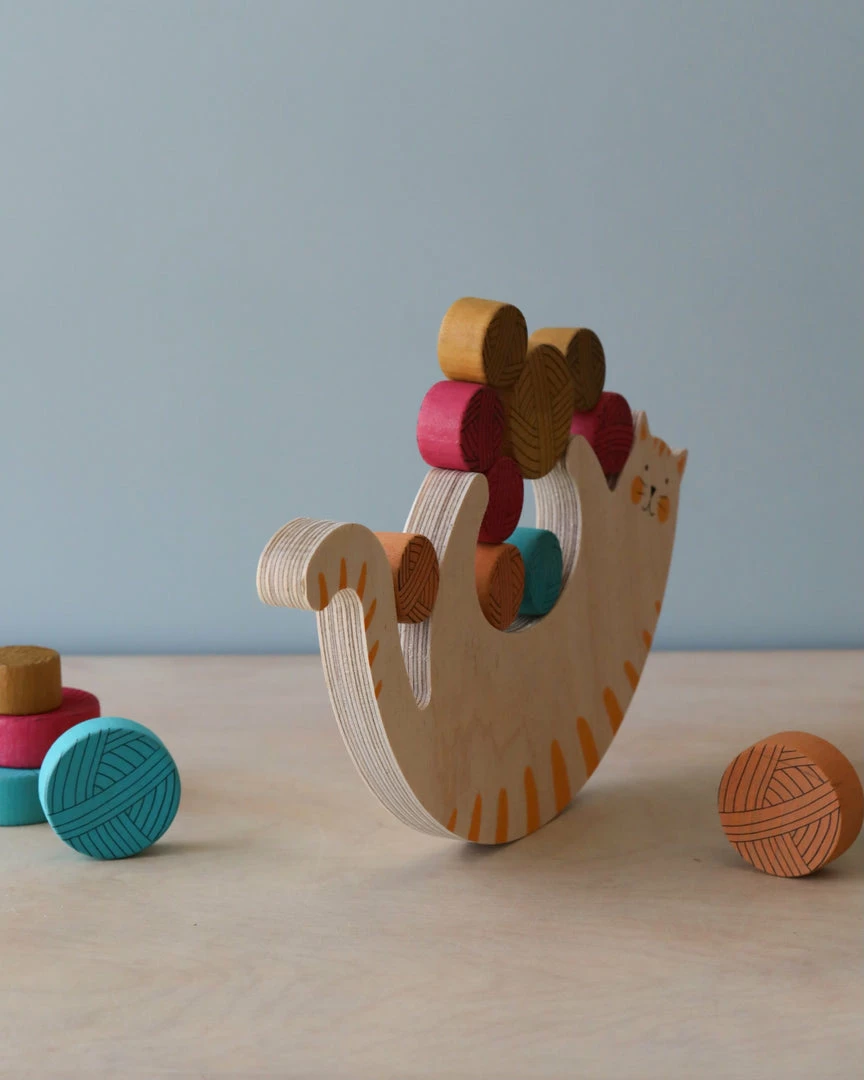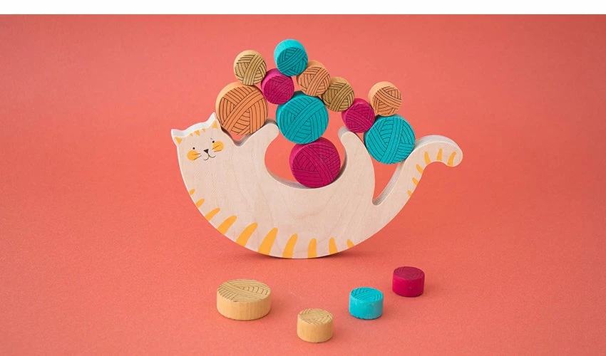 Play with this adorable kitten carrying all the skeins of wool without falling to the ground. Meow! is a wooden toy for the whole family!