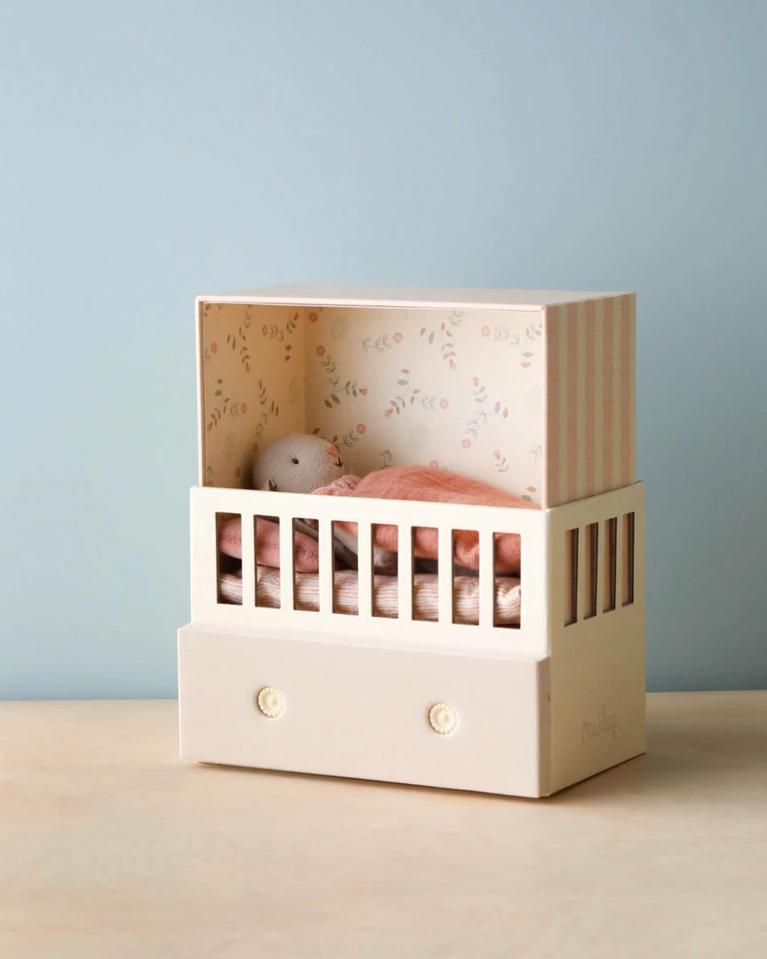 This sweet playful set contains a micro bunny, baby room box, baby suit, ball and a baby bottle. Everything you need for the perfect play and story telling about a baby. Add your favorite baby accessories to extent the story.