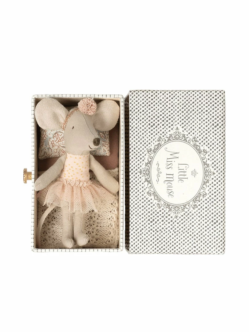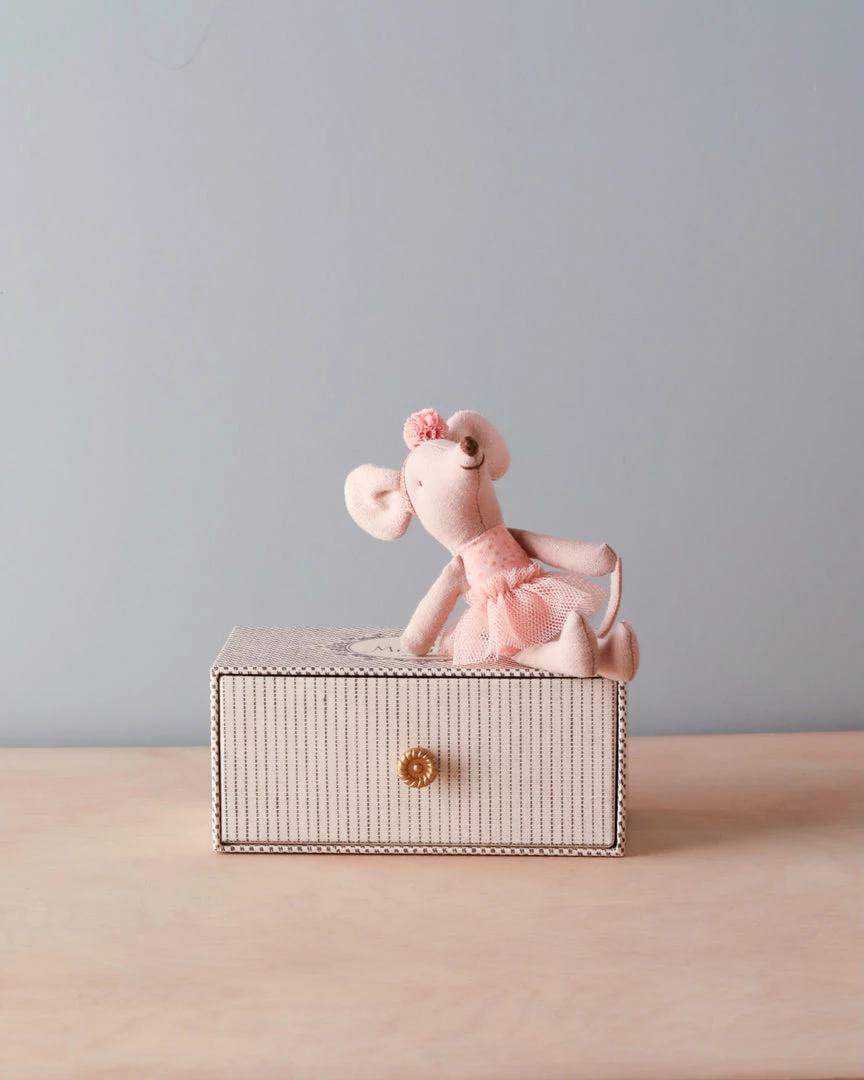 This dancing little sister mouse comes in a beautiful box along with a mini drawer and cushion that can be used as a day bed. It is important to have a place to rest after a long dance lesson.Â