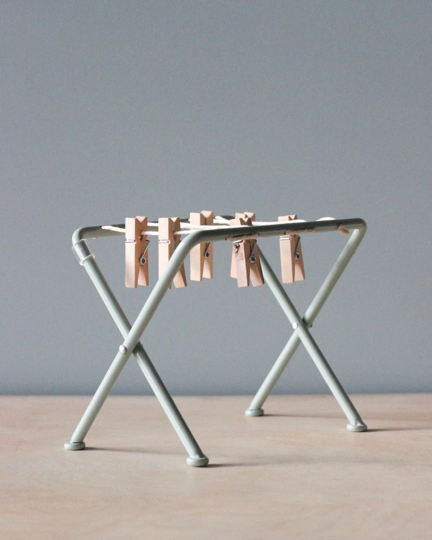 Our new, smaller clothes drying rack is sized right for our micro friends and a perfect fit for the dollhouse. Includes 6 pegs and is painted light aqua.