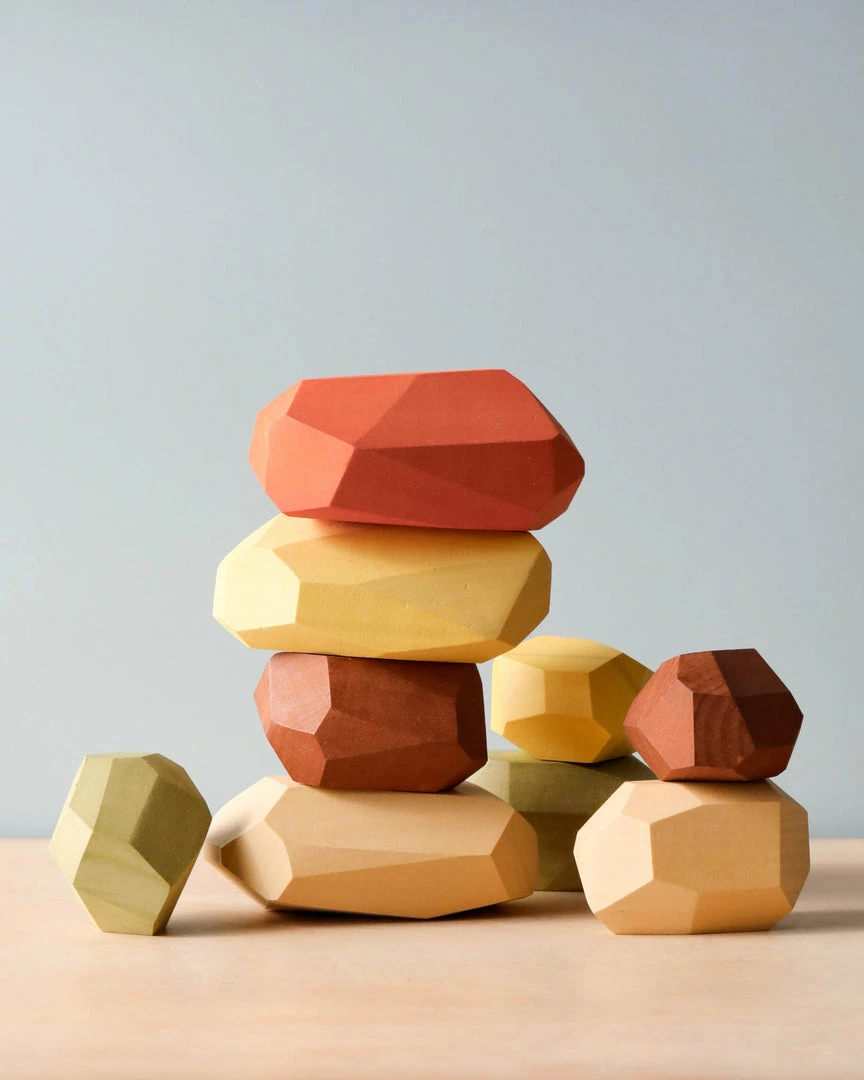 These Balancing Stones are a renewed take on the classic wooden building block, inspired by the ancient Japanese game Tumi-Ishi. The multi faceted rocks allow for endless ways of stacking. Balancing stones assist in developing hand-eye coordination, fine motor skills, observation, logic, and inspire creativity. They are the perfect Montessori toy for children’s playrooms, nurseries, and as home decor. Each set contains 9 wooden stones.