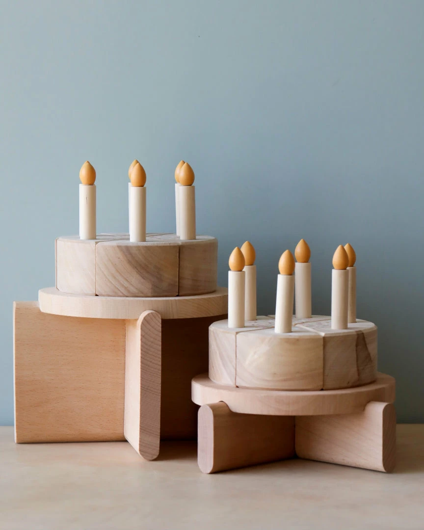 Handmade from birchwood and painted with non-toxic paint. Please note, each cake will have different knots and grains.
