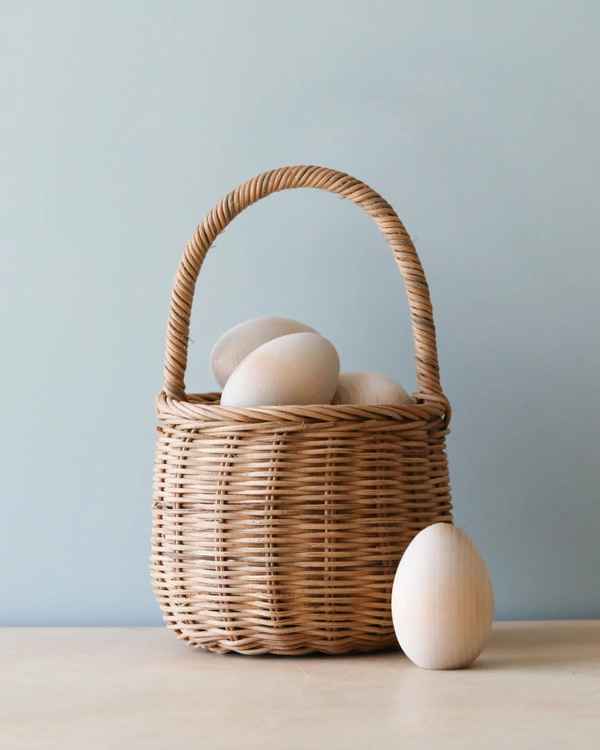 This set includes 12Â wooden eggs and a rattan basket.Â