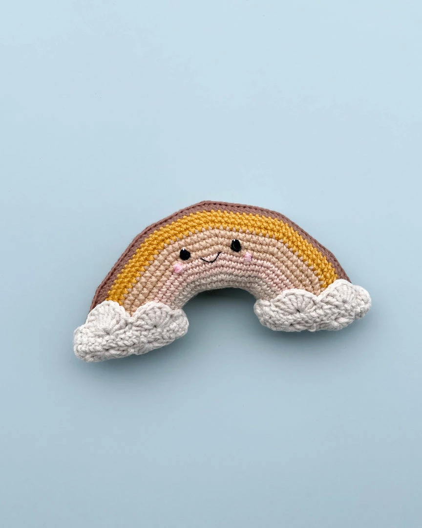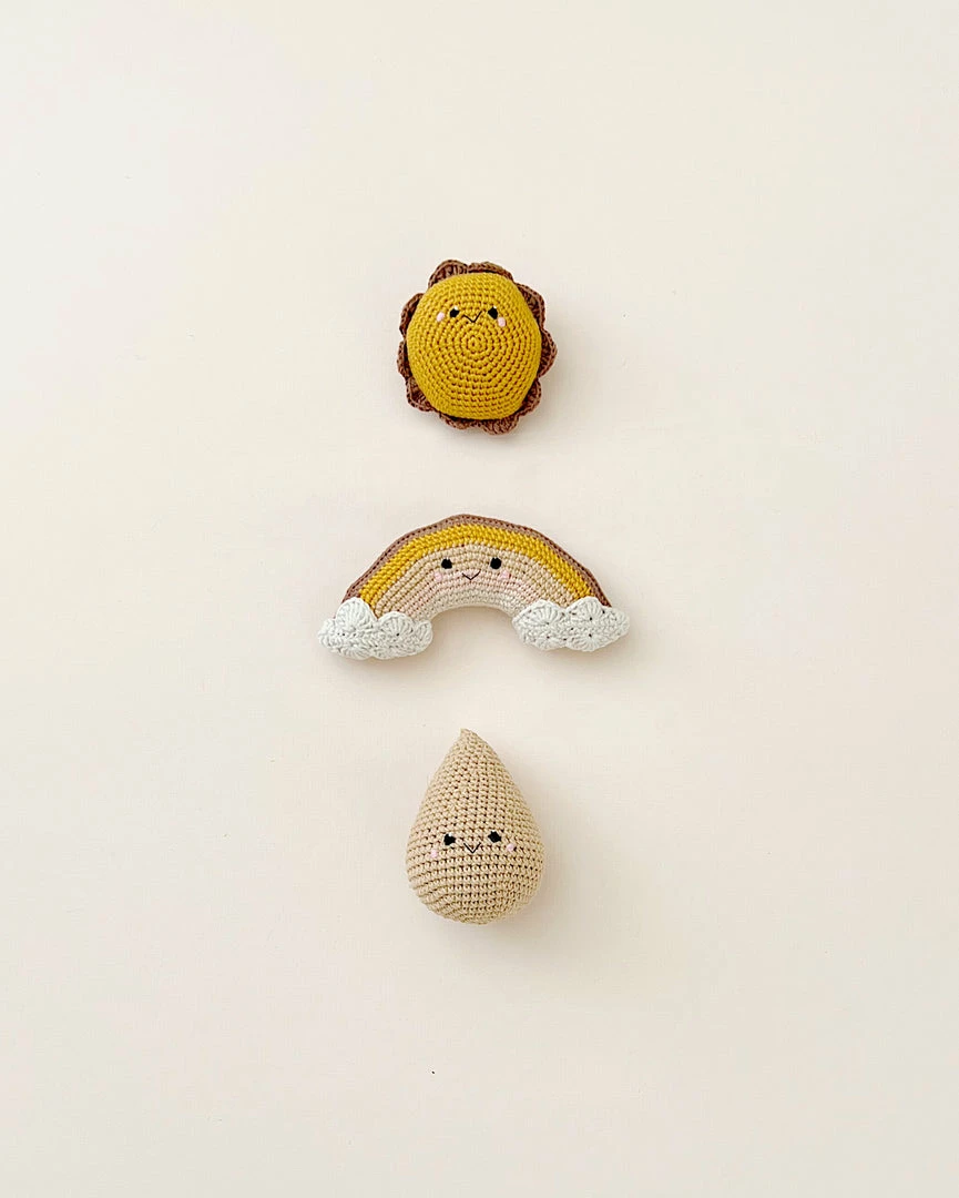 This set includes a sun rattle, rain drop rattle and a rainbow rattle.Â