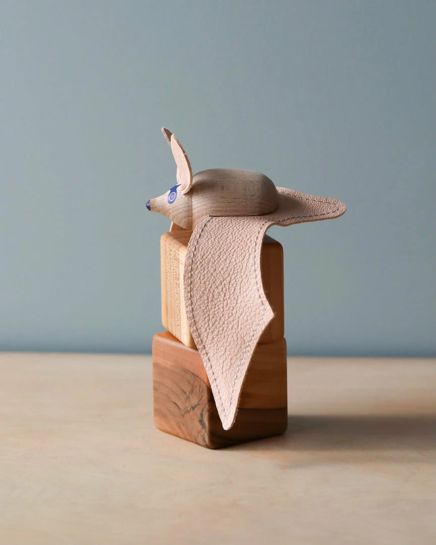 Size: approx. 6cm X 6cm Length of the wings: approx. 21cm (open wing type) Material: hand-painted beech wood and leather wings Comes in a hand-sewn, reusable canvas storage bag