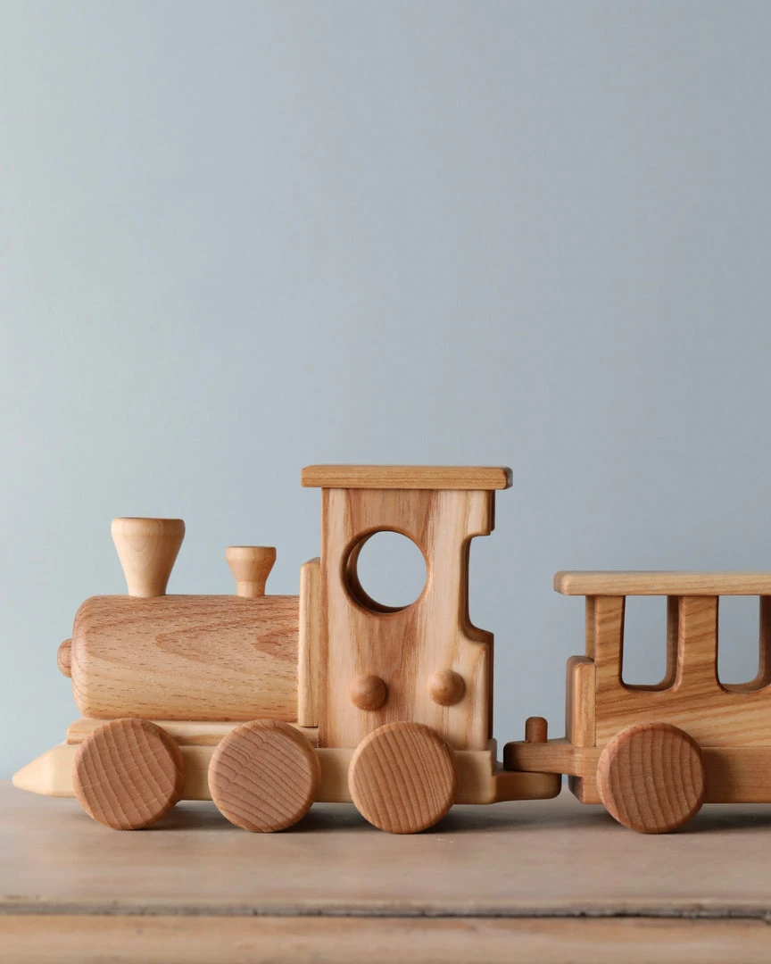 Handmade from beech wood, this set includes the locomotive, one passenger gar and three freight cars.Â