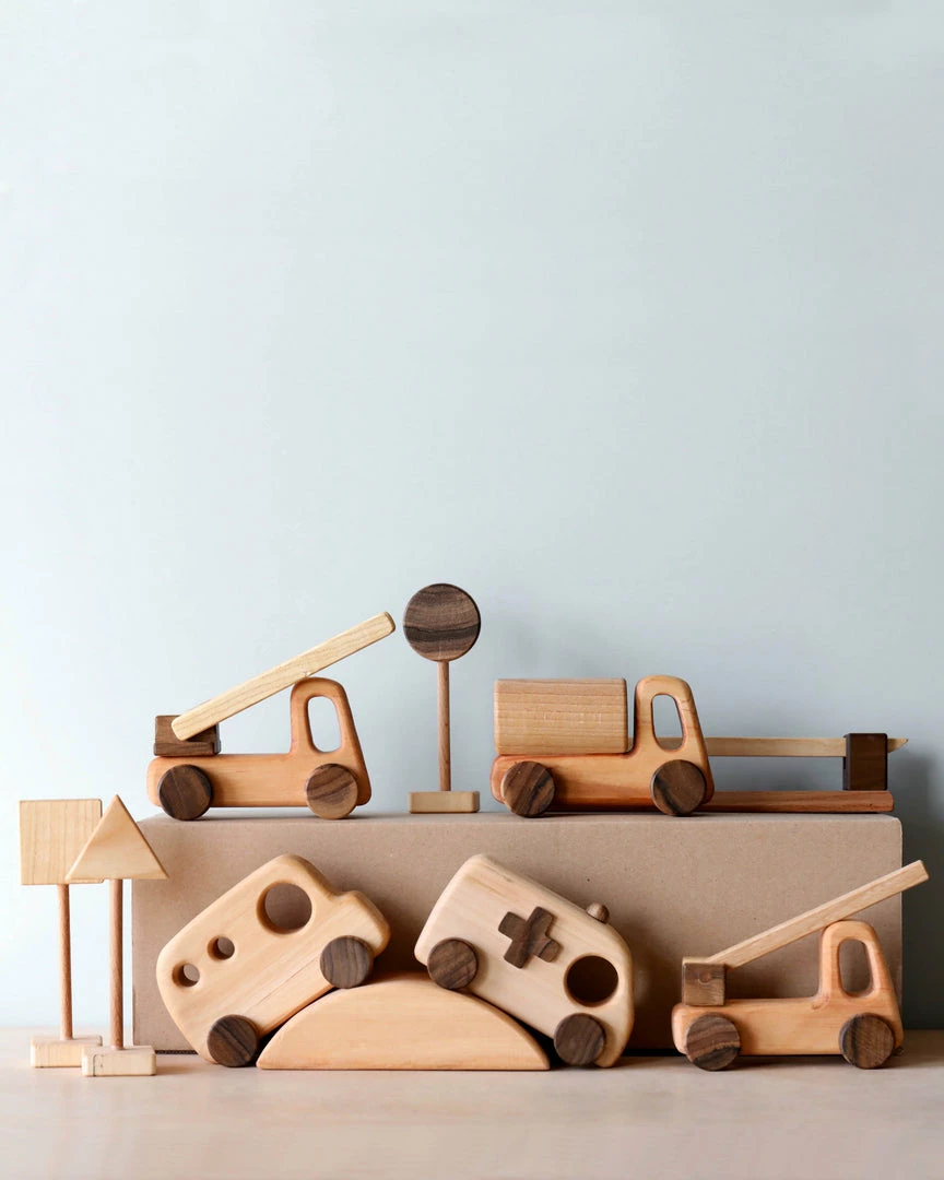 Handmade in Ukraine from beech wood, this set includes six vehicles, 3 road signs, a bridge and a gate.Â