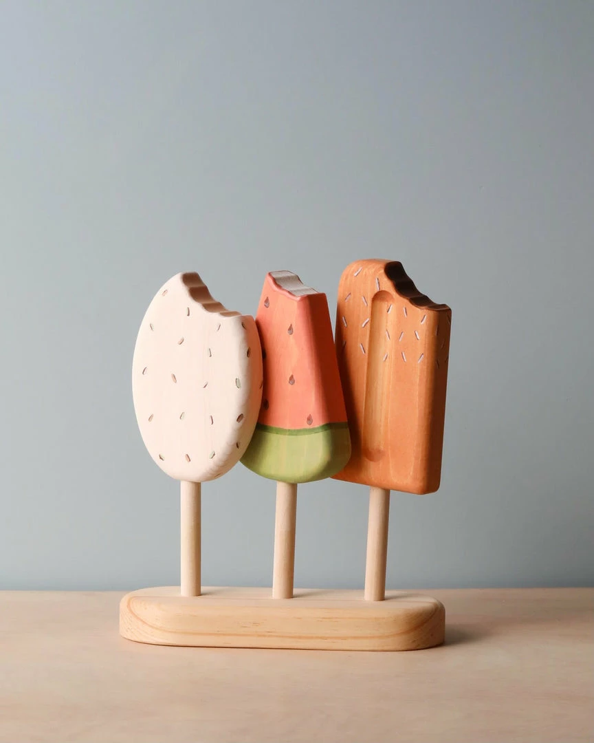 Handmade in Russia and painted with non-toxic paint, this set includes three popsicles and a stand (please note, the popsicles do not stand completely straight).Â