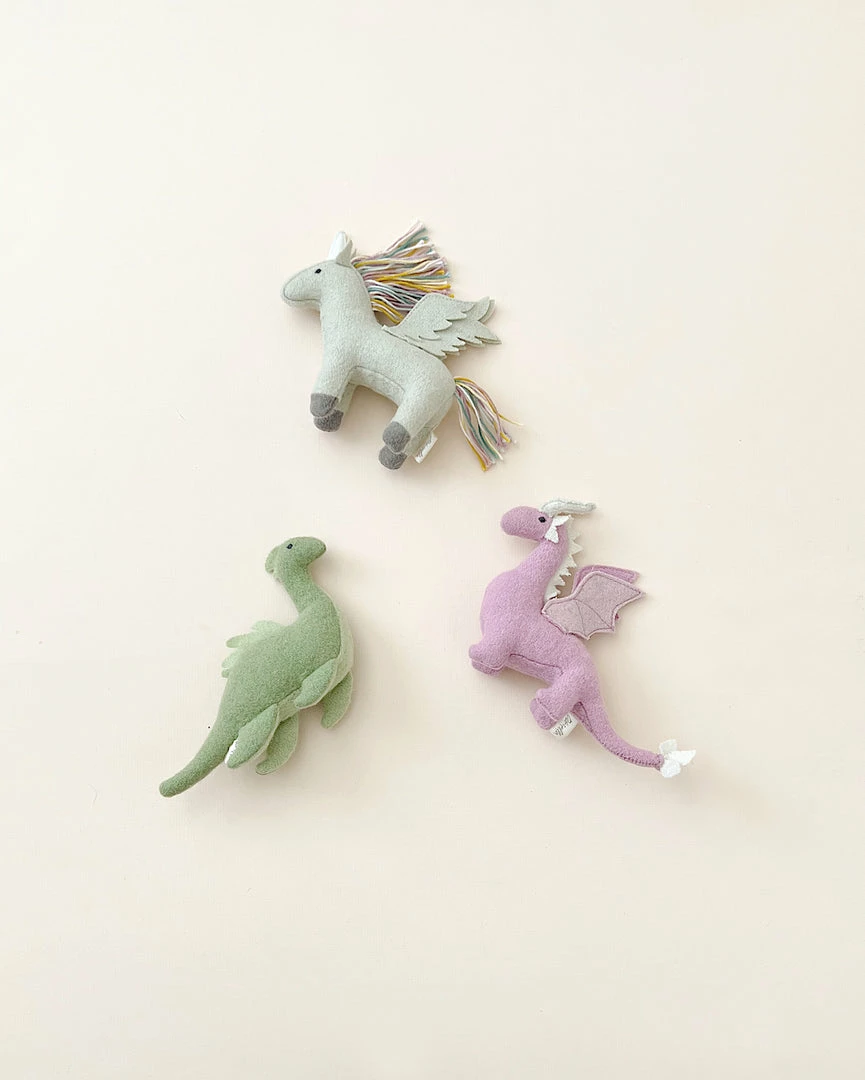These three Magical Creatures are handmade with love from a soft wool blend and have sweet, embroidered features. Each Holdie Magical Creature will look a little bit different, making them extra special. Unicorn, Dragon and Nessy can stand on their own and are the perfect size to fit in a small hand or close by in a pocket for easy cuddles. Come and say hello!Â