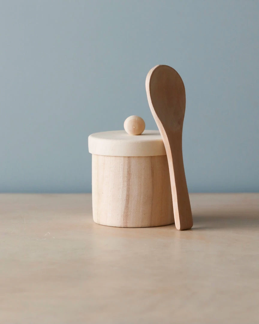 The loveliest little jar and spoon set crafted from 100% Pinewood, the Feeding Set is smooth to the touch and made with little hands in mind. With an easily removable lid, and soft rounded spoon, this feeding set will provide hours of imaginary play for the little chef.Â