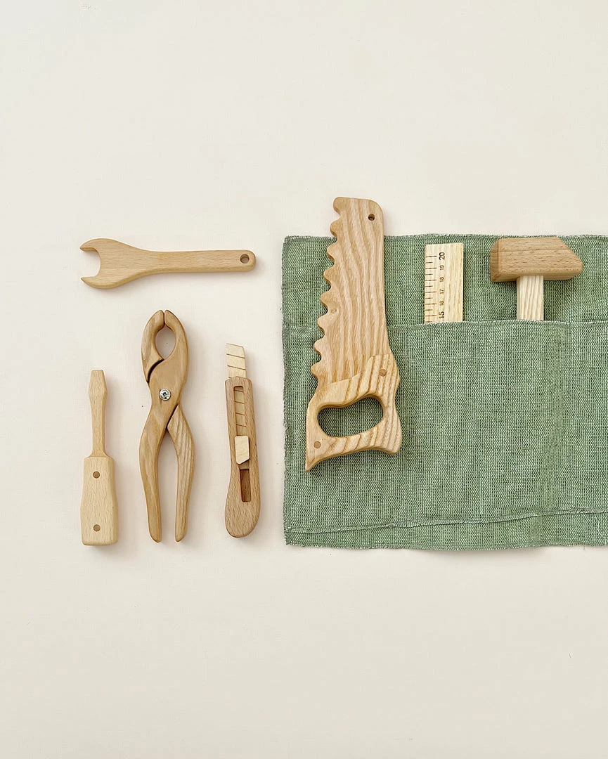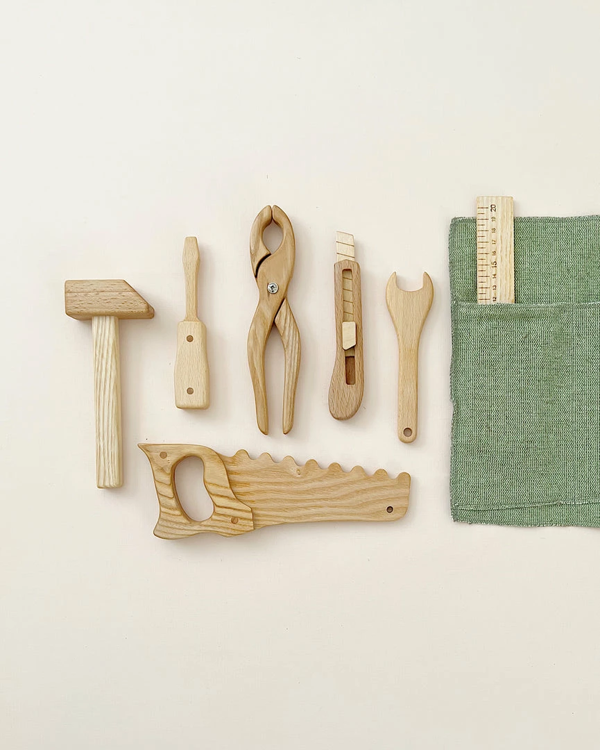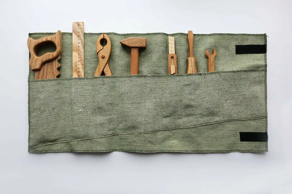 Each set includes a saw, screw driver, knife, hammer, ruler, spanner and pliers.
