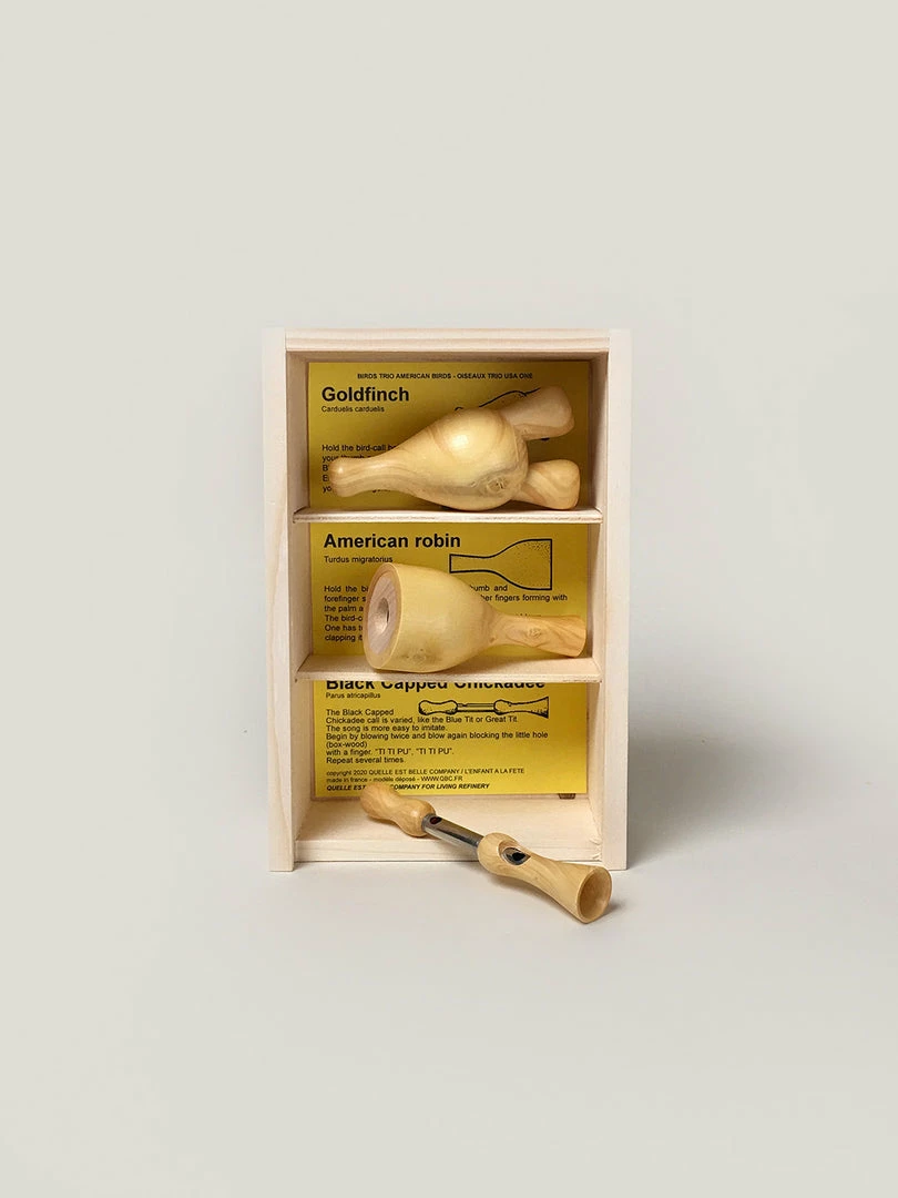 Quelle Est Belle company is an artisan bird call maker based in the Drôme region in France. Monsieur Francois Morel has been making these beautiful wooden bird calls since 1980. Each call is developed to carefully mimic real bird songs, helping you recognise the bird songs in their natural habitat and communicate with them. They are wonderful musical instruments for kids and grown ups alike.