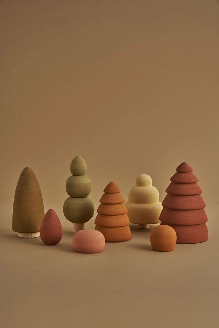 Contains 5 trees and 3 bushes, made from lime wood wit non-toxic paint.Â