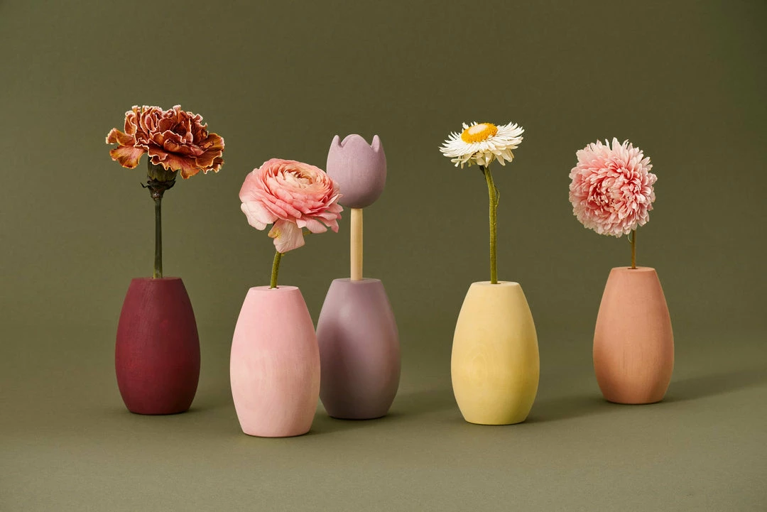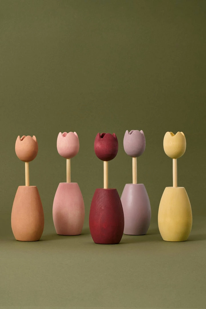 Made by Raduga Grez, this set features five tulips with matching vases. The tulips are removable and can be mixed with different color vases.Â
