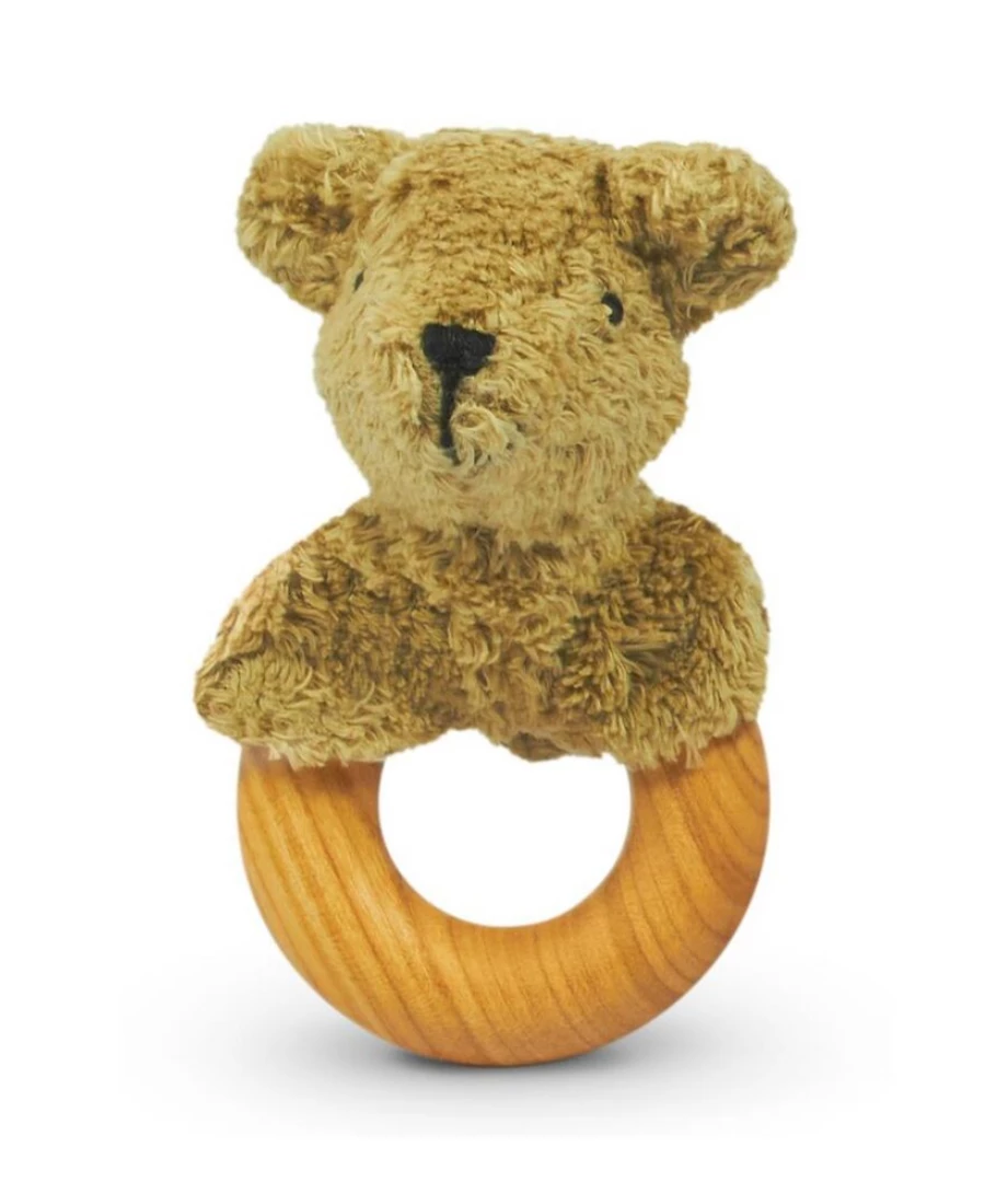 Handmade in Germany, this puppy teether is made of cherry wood and organic cotton.Â