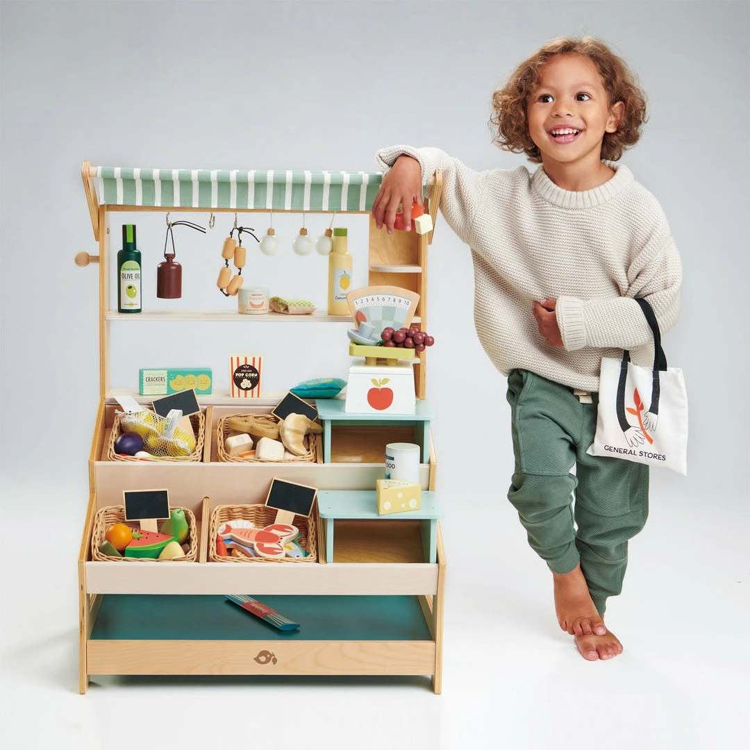 A magnificent market stall with shelves and 2 inter-changeable mini platforms so that it can be adapted to any kind of store. A pretty striped canopy can be lowered to protect your fresh produce from the beaming sun, and at night we have 3 cute light bulbs, metal hooks to hang your fruit and four blackboard price markers. This set also includes a pretty printed tote bag.