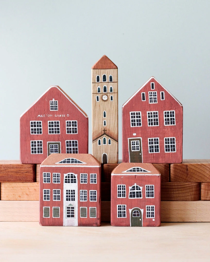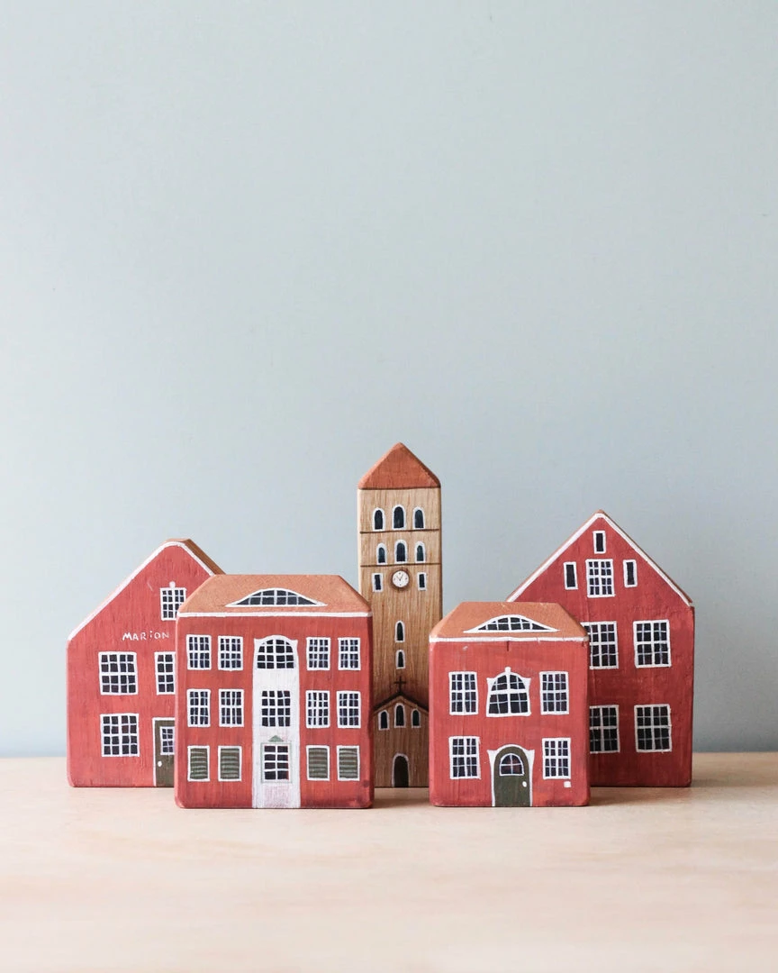 Entirely handmade and hand painted. Each set includes 5 buildings.